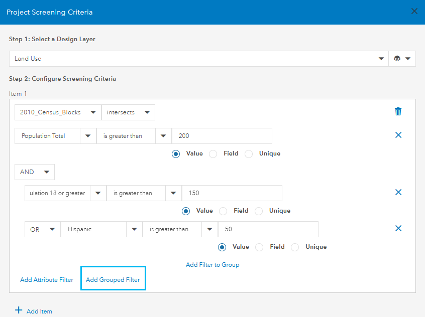 You can connect multiple attribute filters together in an item using a spatial operator such as AND or OR. For example, you may want to find the intersection of a design layer and census tracts where the population of the intersecting census tracts are greater than 200 and where the population over the age of 18 is greater than 150.